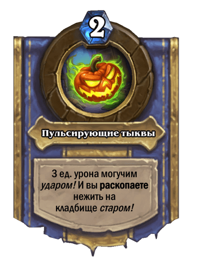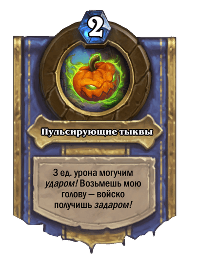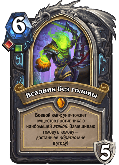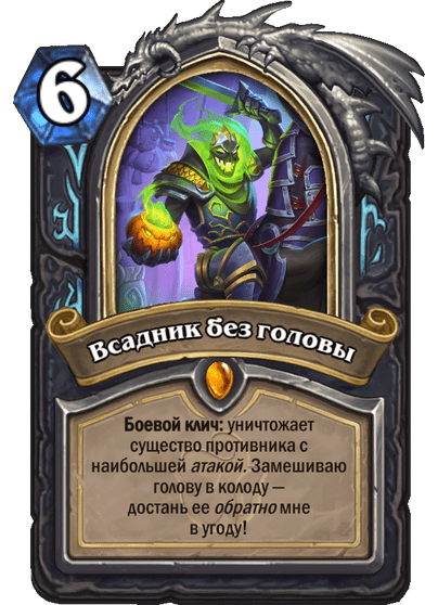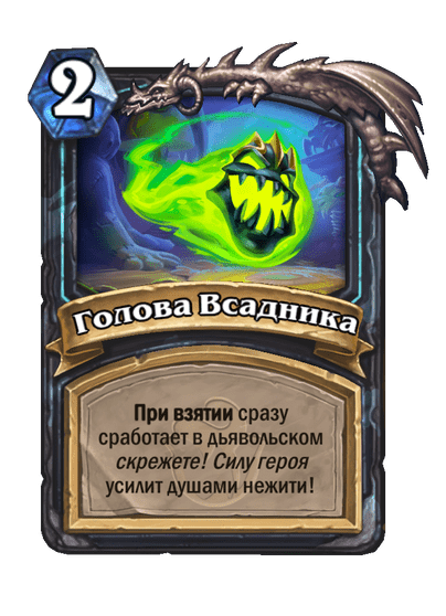 - После розыгрыша она также замешивает в вашу колоду заклинание, которое улучшит вашу силу героя при взятии (а на картинке героя появится голова 🙂 ).